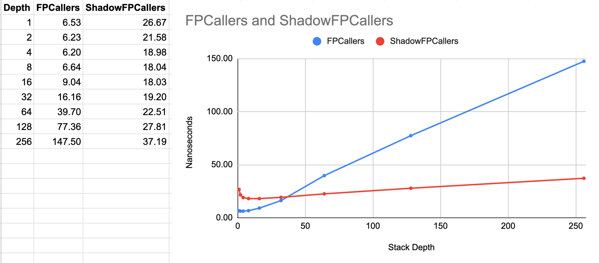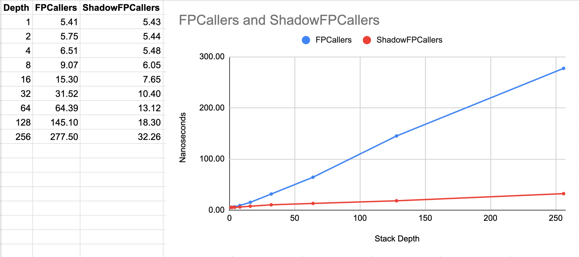 So I decided to implement a ShadowFPCallers function that combines frame pointer unwinding and shadow stacks, and benchmark it against a regular frame pointer unwinding function called FPCallers.