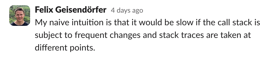 So, what do I mean by shrinking the distance? Well, it turns out that the act of repeatedly capturing stack traces often involves a lot of duplicated work. That's because most of the time only a few leaf frames have changed in between two stack traces being captured, yet we end up re-traversing the unchanged frames over and over again. This insight naturally leads to the idea of maintaining a cache of return addresses that allows us to avoid this duplicate work at the cost of maintaining the cache. Such a cache is also know as a "shadow stack".